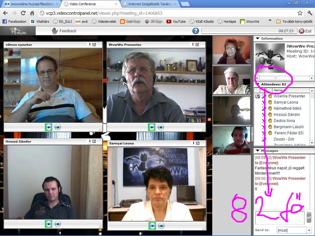 Összefoglalva: A szakemberek szerint az interneten a leghatásosabbak az élő bemutatók, a "szemtől-szembe" online értekezletek, családi, baráti-körös vagy diákcsoportos események konferenciás megoldásai nagy távolságok esetén. Az iWowWe egyszerű rendszerével nagyon eredményes egy ilyen online alkalom. Itt világos a lehetőség, akár 100 fő részvételével, 12 fő egyidejű (hang kép, rajz, stb.) akár HD minőségű közreműködésére. A résztvevők megoszthatják egymással ötleteiket élményüket, megosztható az asztal és a képernyő-felület is, prezentációs jelölő és rajzeszközök, képek, filmek, bemutatók, zenebetétek beépítése és élő mikrofonlehetőség áll rendelkezésre. És a legjobb az egészben az, hogy web-alapú jelszózható, időzíthető, vagyis a fogadó gépen (konferencia résztvevői) nem kell szoftvert telepíteni az alkalmazáshoz. A rendszer akár vizsgáztatásra is alkalmas. Konferenciatermek kezelése és működtetése a jövő új szakmája, ennek a technikának a megtanulására ingyenes képzést ad az iWowWe cég. A kertrendszer már ma is egy jó internetes otthoni munka. |